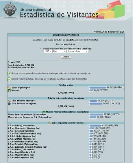 Finalmente, las estadísticas llaman la atención por la nula afluencia registrada en los sitios arqueológicos de Xel-Há y Muyil, que no reportaron una sola visita durante el periodo contabilizado, pese a formar parte de la oferta cultural y turística del estado.