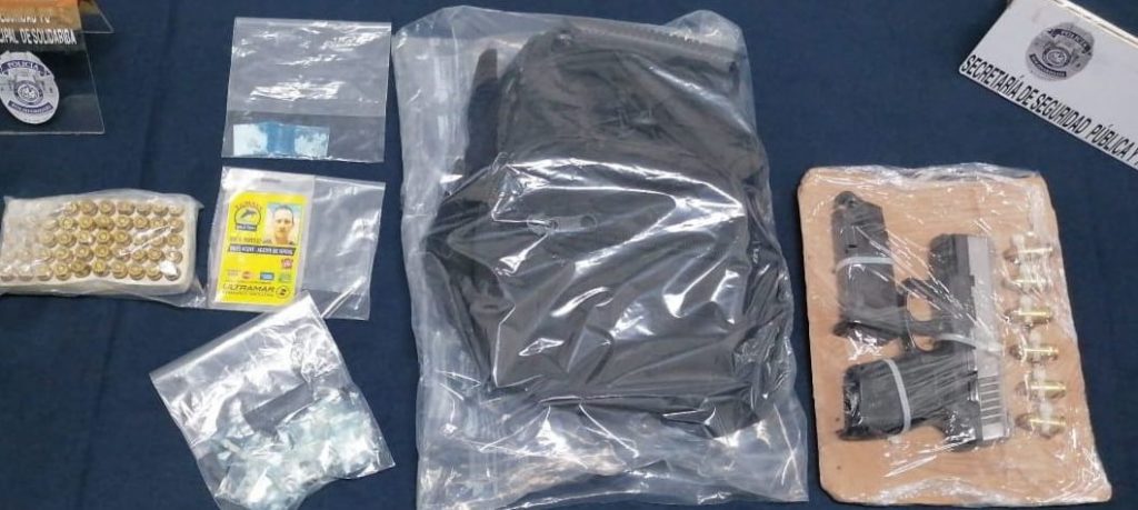 Tras la inspección al bolso los policías encontraron un arma de fuego abastecida con 6 cartuchos útiles, una caja con 50 cartuchos útiles, 17 envoltorios con lo que parece la droga llamada piedra y 2 con posible cocaína, por lo que fueron puestos a disposición de la Fiscalía General del Estado para el deslinde de responsabilidades.