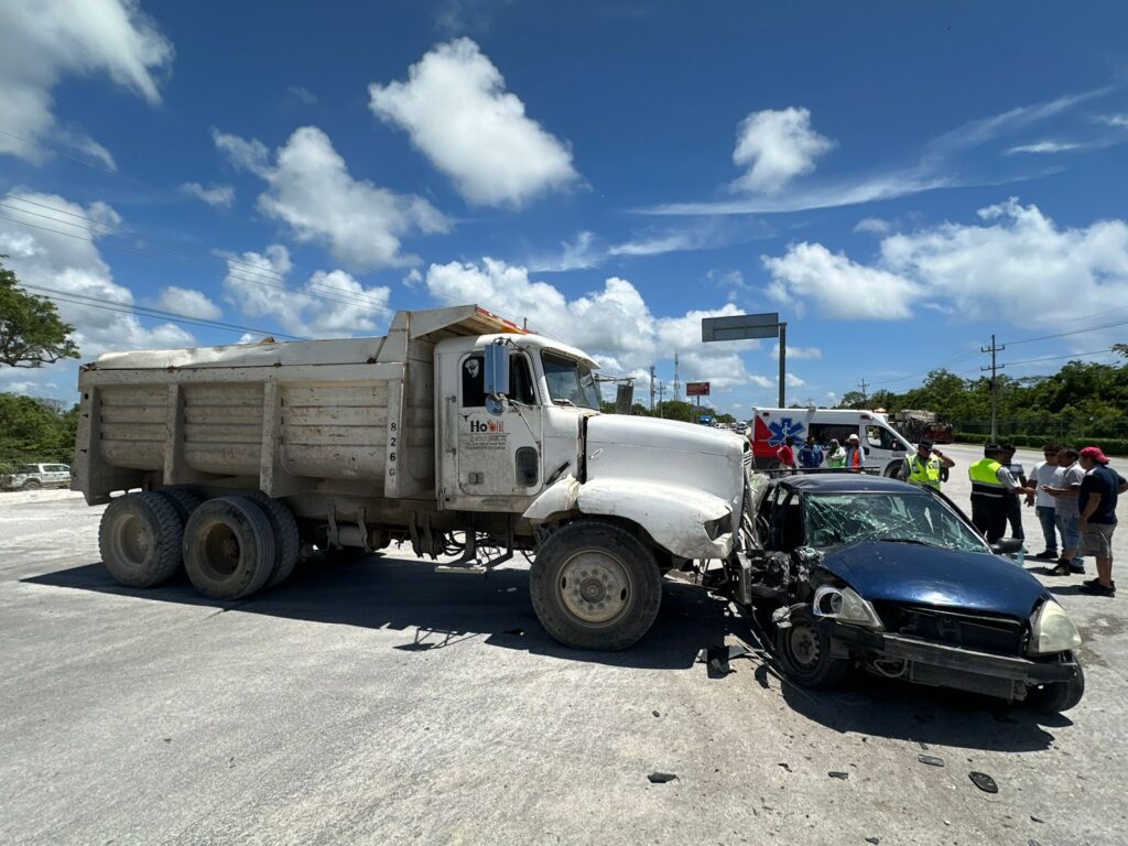 El accidente se registró alrededor de las 12:00 del día, cuando un volquete, que forma parte de las obras del Tren Maya, salió de manera imprudente del retorno, sin respetar el paso preferencial. En ese momento, un Nissan Platina, color azul, con placas USE 746 K, circulaba por la carretera y fue golpeado en uno de sus costados por el tráiler.