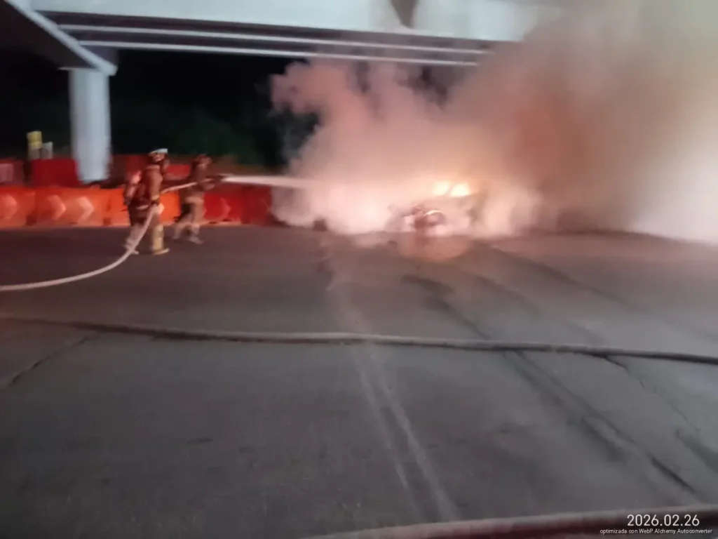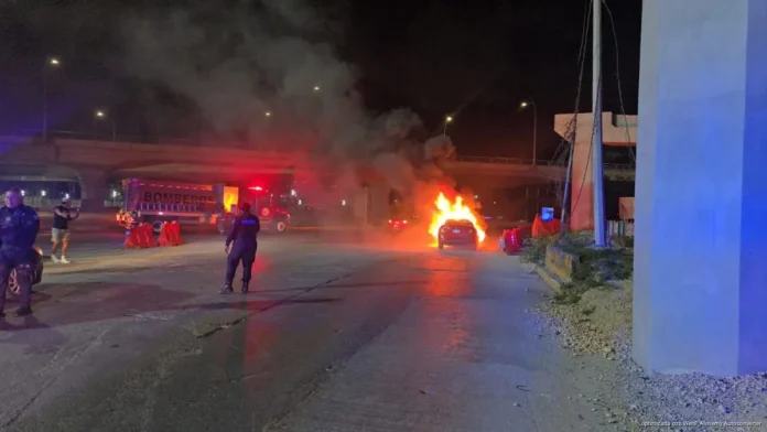 CANCÚN, Quintana Roo, 27 de febrero de 2026.— Un vehículo fue consumido por el fuego la noche del jueves en el cruce de las avenidas Kabah y Colosio, lo que generó movilización de cuerpos de emergencia y alarma entre automovilistas que transitaban por la zona. A pesar de lo aparatoso del siniestro, no se reportaron personas lesionadas.