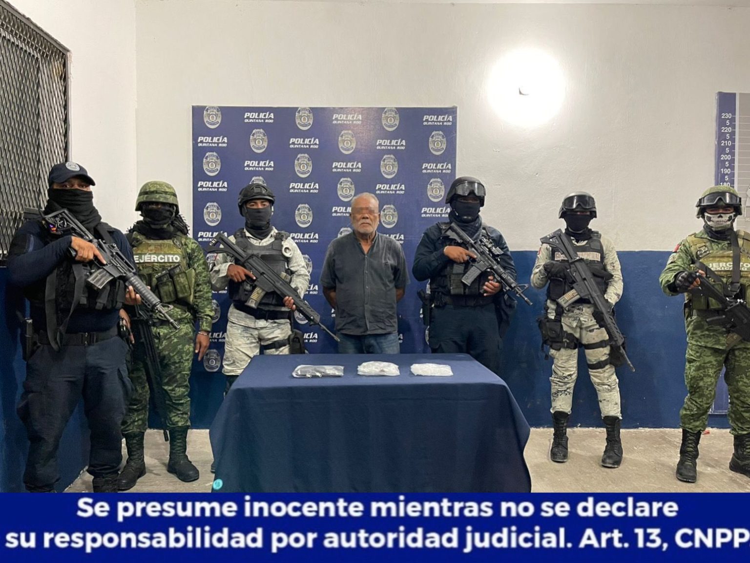 CHETUMAL, Quintana Roo, 31 de marzo. – La Secretaría de Seguridad Pública (SSP) de Quintana Roo en colaboración con el Grupo de Coordinación para la Construcción de Paz, detuvo a Domitilo ”N” de 65 años, por su probable participación en delitos contra la salud, en su modalidad de narcomenudeo.