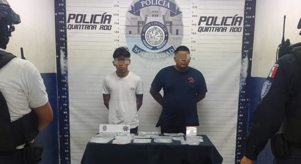Playa del Carmen, Quintana Roo, 07 de junio. – Durante el operativo de prevención y disuasión de delitos en la Quinta Avenida, elementos de la Policía Municipal de Solidaridad aseguraron a dos sujetos en posesión de más de 40 posibles dosis de narcóticos y 3 cartuchos útiles.