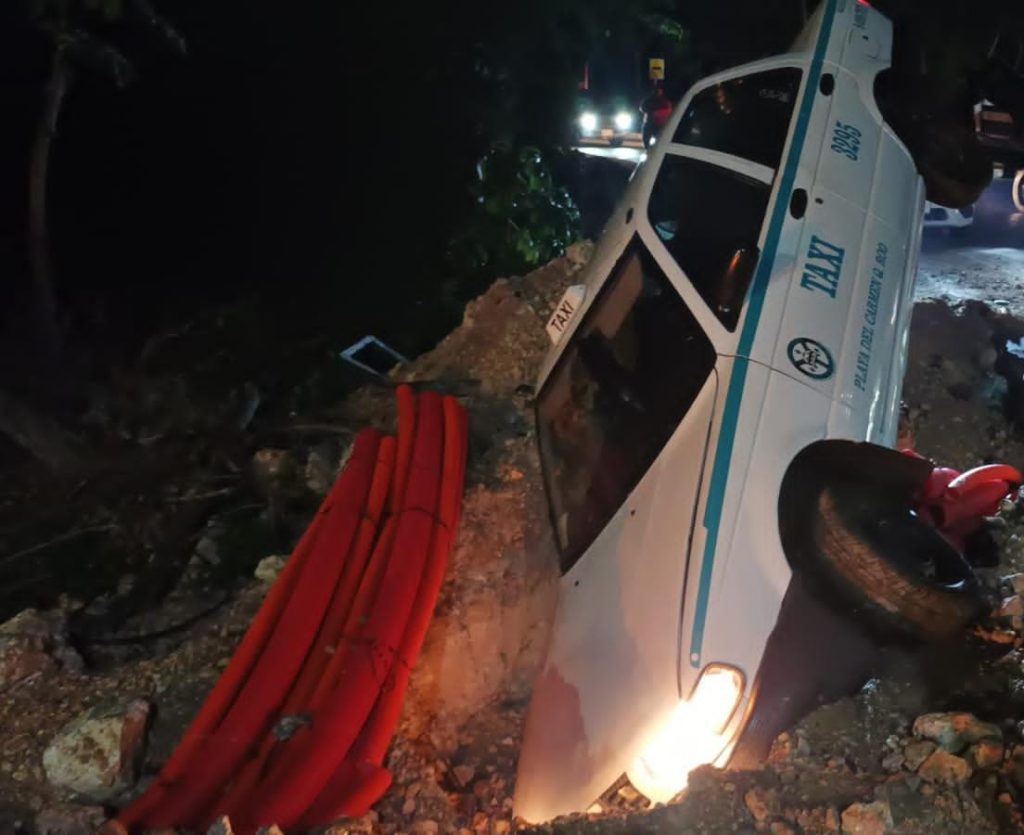 PLAYA DEL CARMEN, Quintana Roo, 28 de junio. –  Taxista despistado cae en un hueco que hay en la salida del fraccionamiento Villas del Sol, hecho para meter cables, por lo que su unidad quedó suspendida en el aire, hasta que una grúa llegó a ayudarlo para mover la unidad.