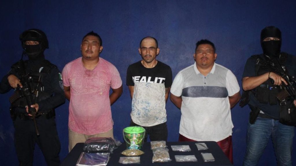 CANCÚN, Quintana Roo, 10 mayo. – La Secretaría de Seguridad Ciudadana (SSC) en coordinación con la Fiscalía General del Estado (FGE) logró la detención de José “N”, Andy “N” y Kenyi “N”, por su probable participación en delitos contra la salud en Benito Juárez.