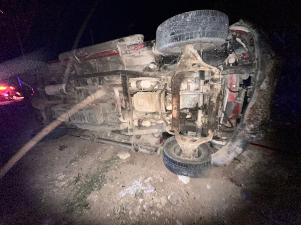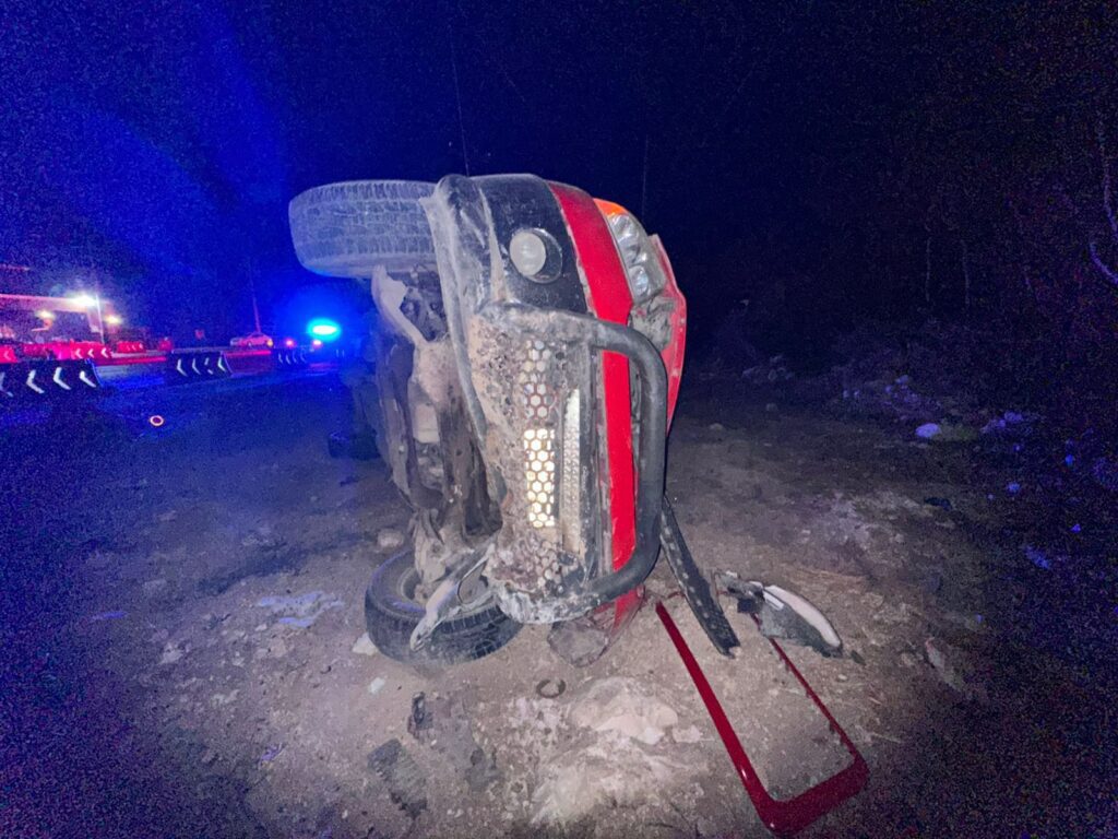 PLAYA DEL CARMEN, Quintana Roo,11 de Agosto–Una camioneta Ford Lobo, color rojo, terminó volcada la madrugada de este lunes en la carretera federal 307, a la altura de Xpu Ha, luego de que su conductora perdiera el control al quedarse dormida frente al hotel Catalonia Royal Tulum.