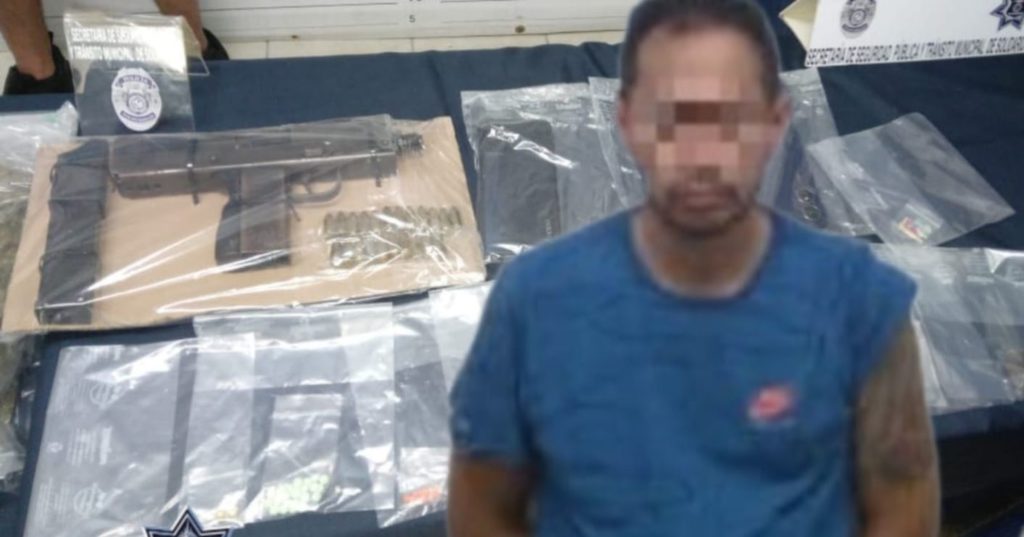 Fue sobre las avenidas Los Olivos y Sin Nombre, cuando policías preventivos observaron a una persona manipulando lo que parecían ser narcóticos y al aproximarse el sujeto intentó emprender la huida, pero fue asegurado, y tras una inspección de seguridad encontraron un arma de fuego, 22 cartuchos y diversos envoltorios con posibles drogas como marihuana, cocaína, cristal y LSD.