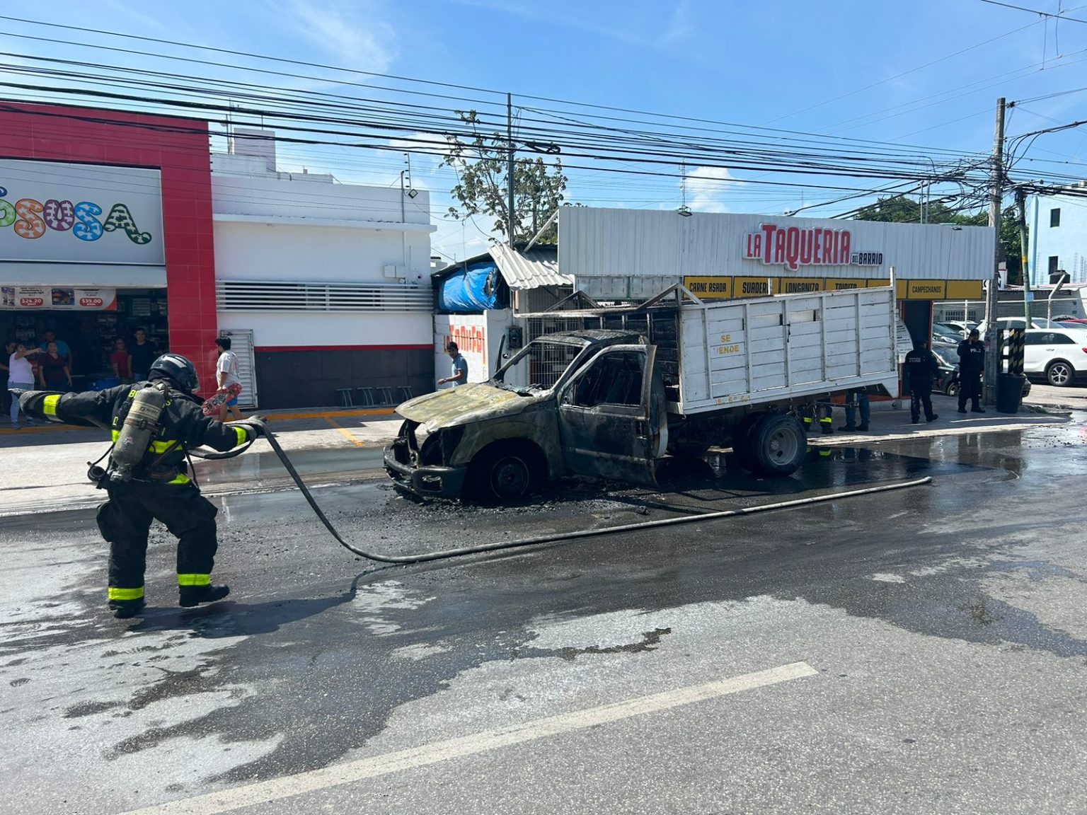 Playa del Carmen, Quintana Roo, 16 de abril de 2024. – Vecinos de la colonia Ejido muy asustados pidieron la intervención de los Bomberos, luego de que el chofer de una camioneta pidió ayuda, ya que al ir andando el vehículo comenzó a incendiarse, hasta que fue consumido en su totalidad por el fuego.