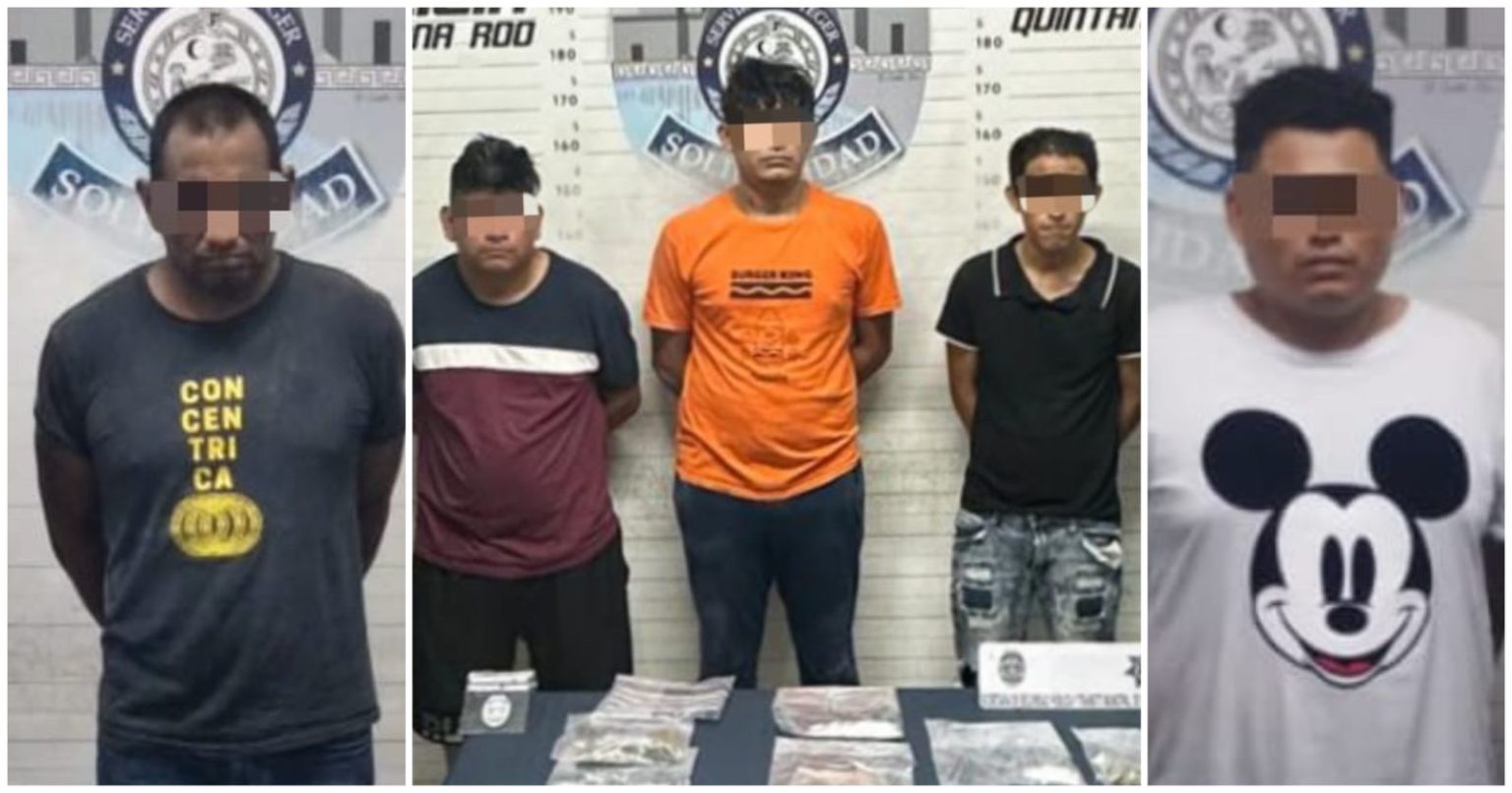 Cuando patrullaban en el fraccionamiento Villas del Sol, los policías aseguraron a Seus “N” de 25 años de edad, originario de Campeche, a Ronal “N” de 22 años, de Chetumal y a Jesús “N” de 32 años, procedente de Chiapas, que fueron detenidos con 76 envoltorios con posible metanfetamina y 8 con posible marihuana, luego de ser sorprendidos junto a un vehículo tipo Saveiro intercambiándose los envoltorios y tratando de huir a bordo del mismo.