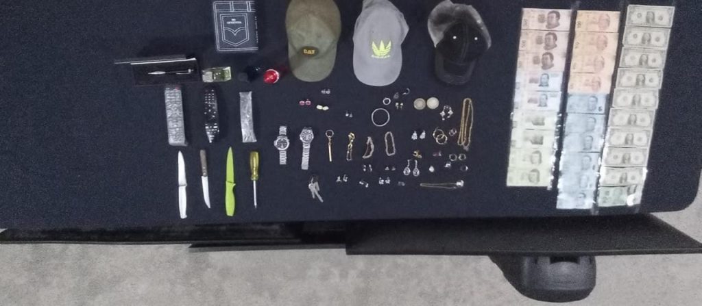 Los oficiales procedieron a marcarle el alto sin embargo los tripulantes hicieron caso omiso, por lo anterior lograron detener al vehículo metros adelante, solicitandoles una revisión debido a que derivado de los trabajos y seguimiento a través de las cámaras video vigilancia del c5, se puede advertir la posible participación de dicho automotor en el robo a casa habitación consumado en el municipio de Benito Juárez, dando pauta a tener datos del vehículo señalado y psoteriormente su localización, logrando asegurar 3 cuchillos, dinero en efectivo, un reloj, joyas, un desarmador, 3 pantallas y una bocina.