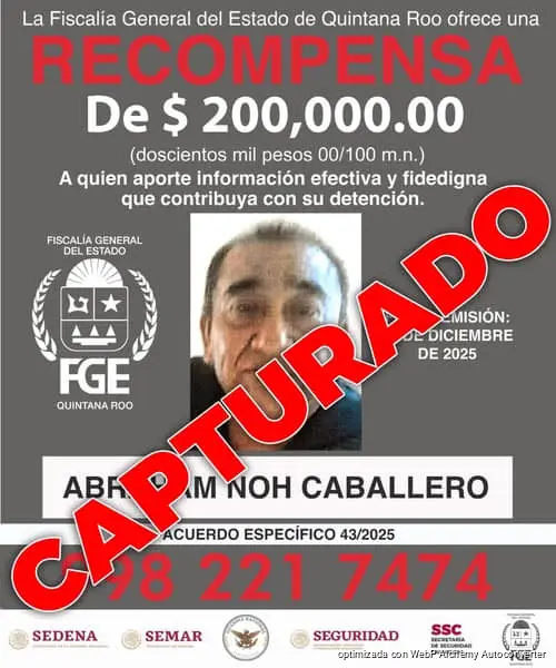 Cabe destacar que, derivado de estos hechos, la Fiscalía General del Estado de Quintana Roo emitió el 17 de diciembre de 2025, una ficha de recompensa por 200 mil pesos, a quien aportara información efectiva y fidedigna que contribuyera a la detención del investigado.