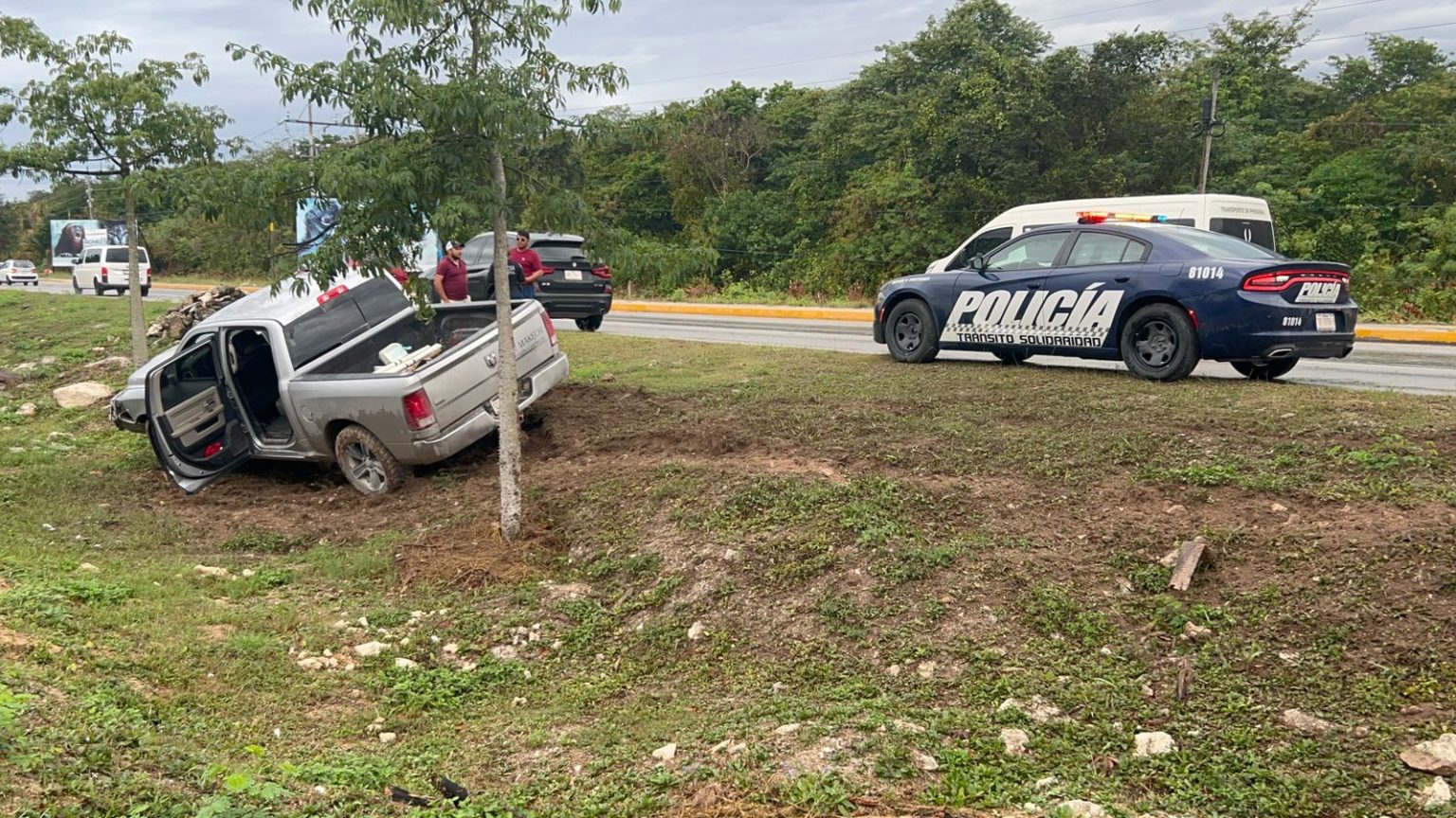 Playa del Carmen, Quintana Roo, 19 de febrero de 2024. – Chofer de una camioneta Ram 2500 pierde el control en el boulevard Playa del Carmen esto cuando circulaba a exceso de velocidad y se salió un poco de la vía de rodamiento y se metió entre el camellón central en las cercanías del sindicato Lázaro Cárdenas del Río de los taxistas.