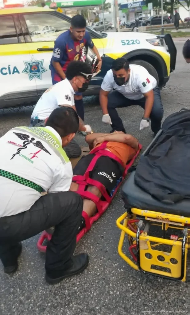 CANCÚN, Quintana Roo, 09 de febrero de 2026.- Un fuerte accidente de tránsito se registró la tarde de este lunes sobre la avenida Chac Mool, a la altura del cruce con la avenida Leona Vicario, dejando como saldo un hombre gravemente lesionado y una intensa movilización de cuerpos de emergencia.