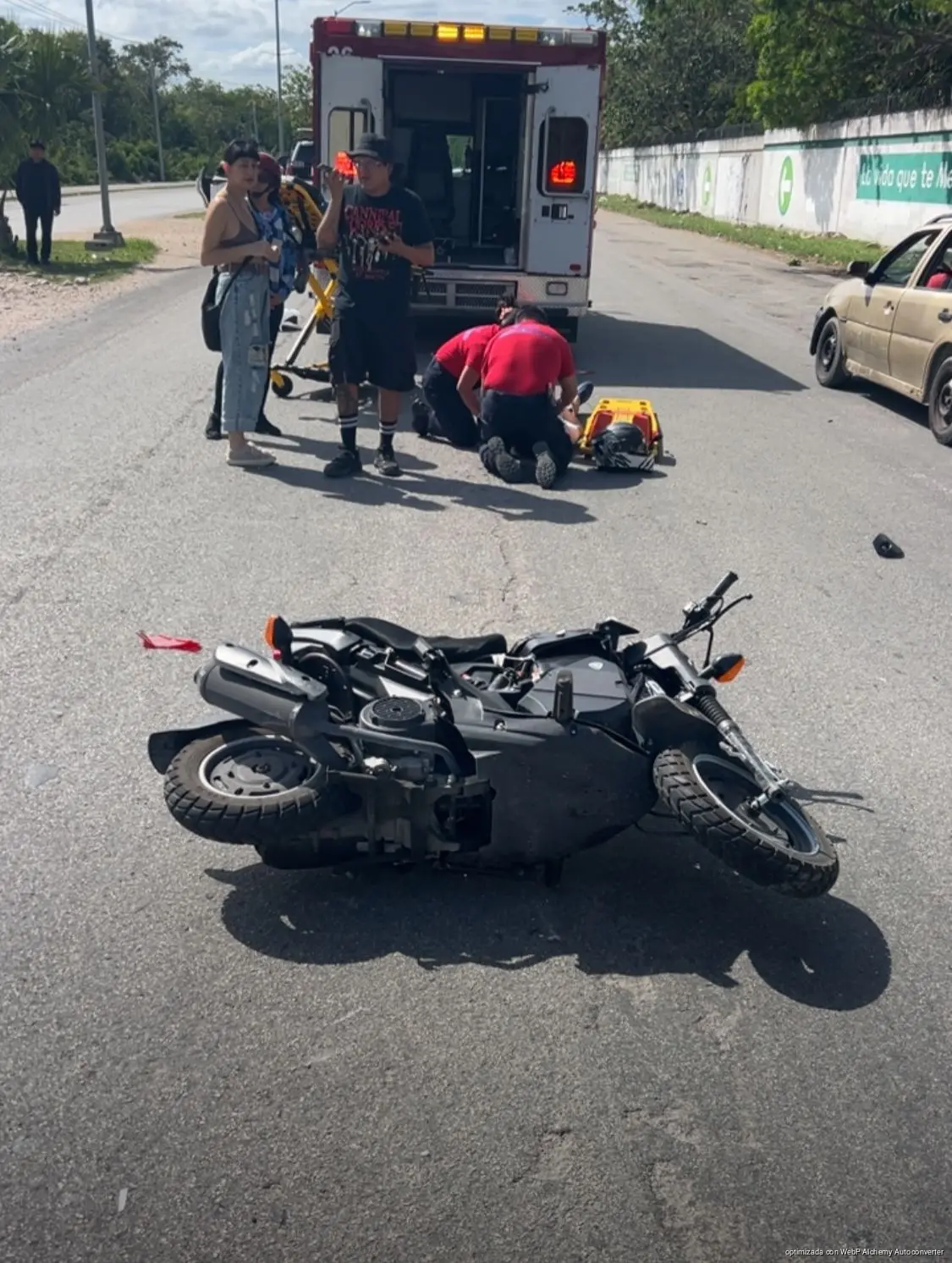PLAYA DEL CARMEN, Quintana Roo, 14 de abril de 2026.- Un motociclista fue trasladado al hospital luego de impactarse contra la parte trasera de un taxi en una de las entradas del fraccionamiento Real Ibiza, presuntamente por circular a exceso de velocidad y no percatarse de que la unidad de alquiler disminuyó su marcha.