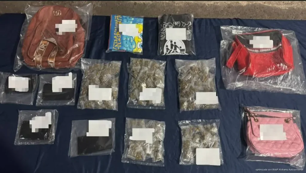 Se decomisaron 250 bolsitas transparentes tipo ziploc, que contenían vegetal verde y seco similar a la marihuana; una mochila color café, dos bolsas tipo ecológica, una bolsa tipo sobaquera, un bolso color rosa y cuatro celulares.