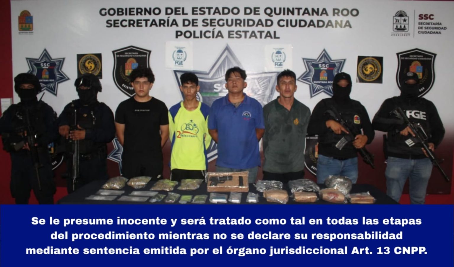 CANCÚN, Quintana Roo, 30 de agosto. — La Secretaría de Seguridad Ciudadana (SSC), en colaboración con la Fiscalía General del Estado (FGE), pone a disposición a cuatro personas por su probable participación en delitos contra la salud y el delito de Violación a la Ley Federal de Armas de Fuego y Explosivos, en Benito Juárez.