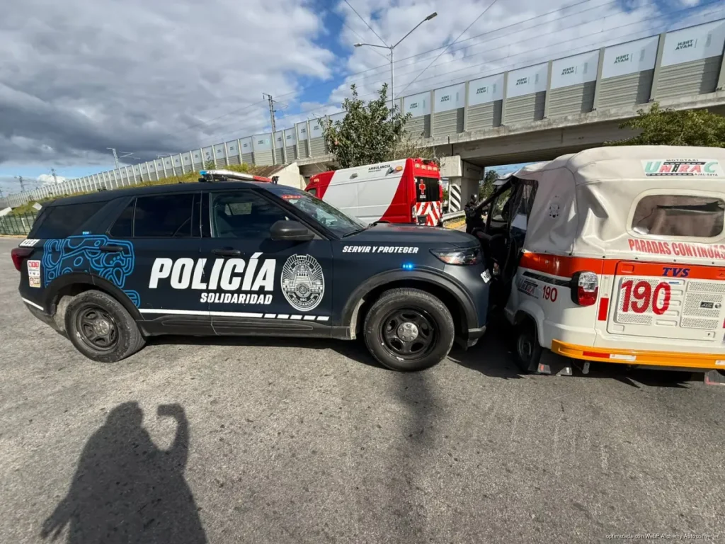 PLAYA DEL CARMEN, Quintana Roo, 03 de febrero de 2026.- Un accidente vial se registró en el cruce de las avenidas Azulejos con Sur, donde una patrulla policial se vio involucrada en un choque con un mototaxi, resultando responsables los elementos que tripulaban la unidad oficial, de acuerdo con los primeros informes recabados en el lugar.