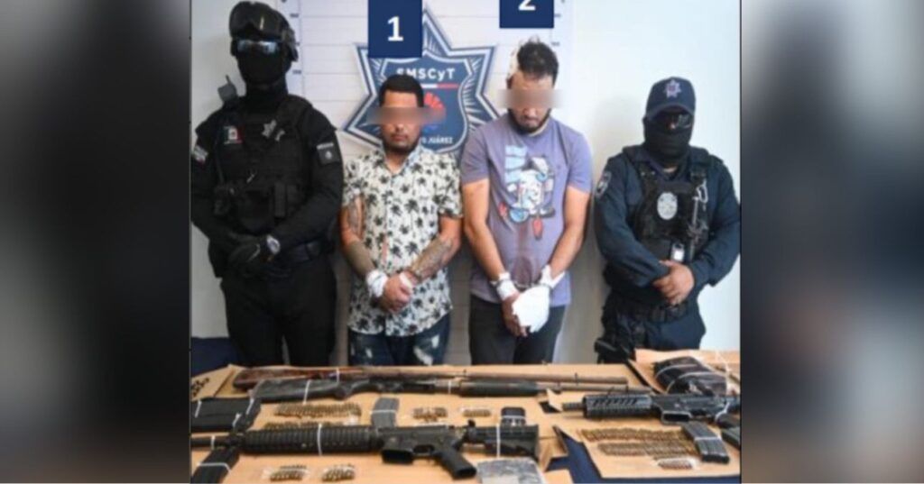 Durante la inspección del vehículo, se encontraron diversas armas de fuego y cargadores con cartuchos útiles. Los detenidos, identificados como Juan “N”, de 28 años, y Salvador “N”, de 24, originarios de Tamaulipas, fueron puestos a disposición de la Fiscalía General del Estado para continuar con las investigaciones correspondientes.