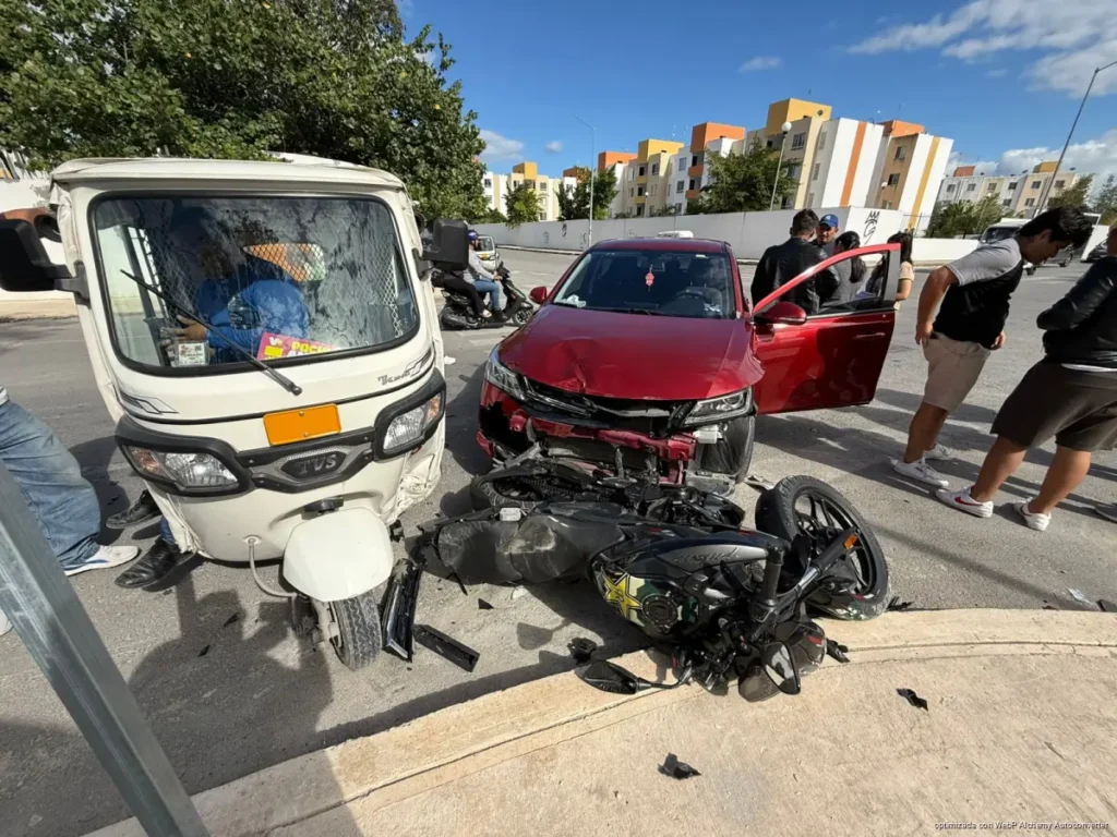 PLAYA DEL CARMEN, Quintana Roo, 03 de febrero de 2026.- Un accidente de tránsito se registró la tarde de este martes en el fraccionamiento Xcacel, específicamente sobre la vialidad Paseos Sisal, dejando como saldo un motociclista lesionado y daños materiales en tres unidades involucradas.