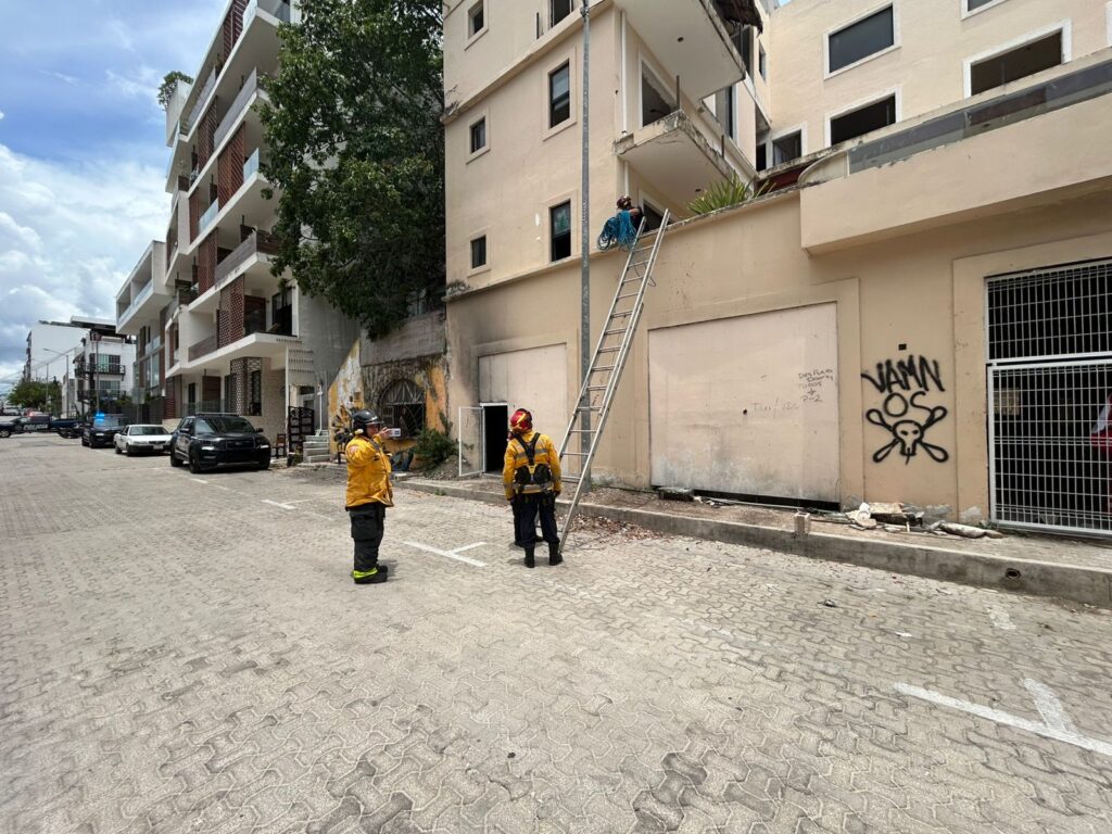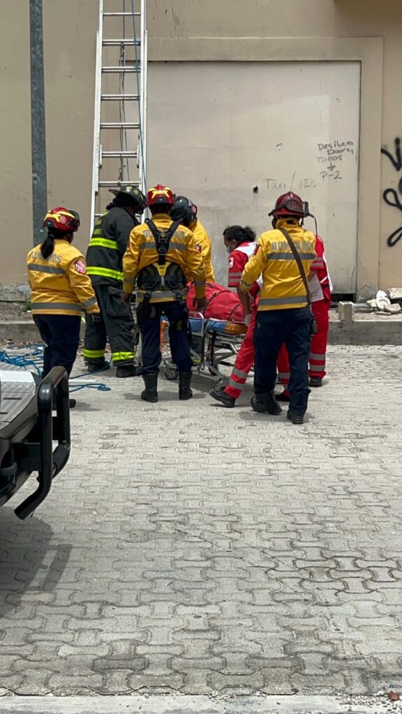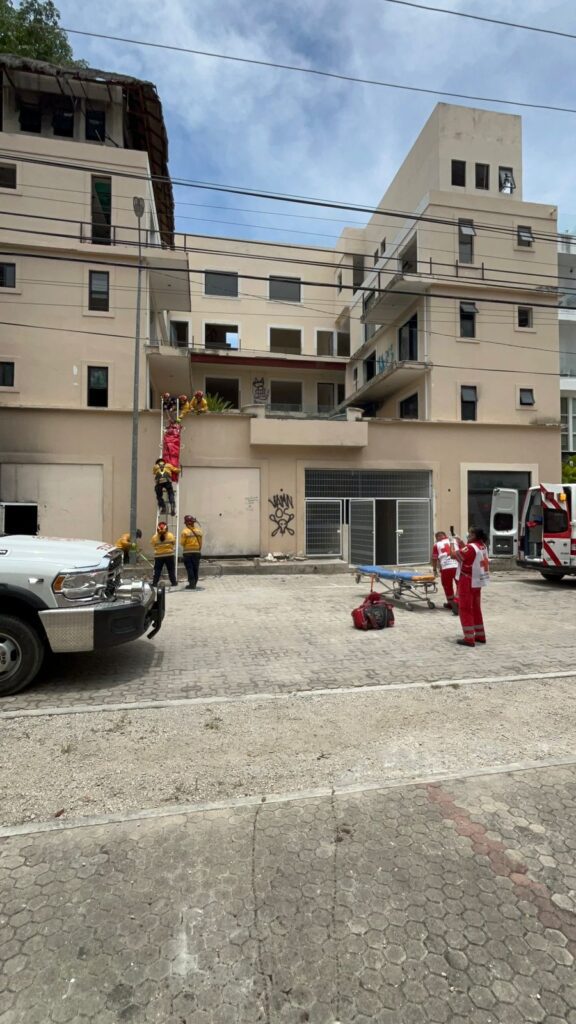 PLAYA DEL CARMEN, Quintana Roo,08 de Agosto–Elementos del Heroico Cuerpo de Bomberos y paramédicos de la Cruz Roja rescataron la tarde de este viernes a un hombre en situación de calle que cayó desde una altura aproximada de tres metros dentro de un condominio abandonado en la colonia Gonzalo Guerrero.