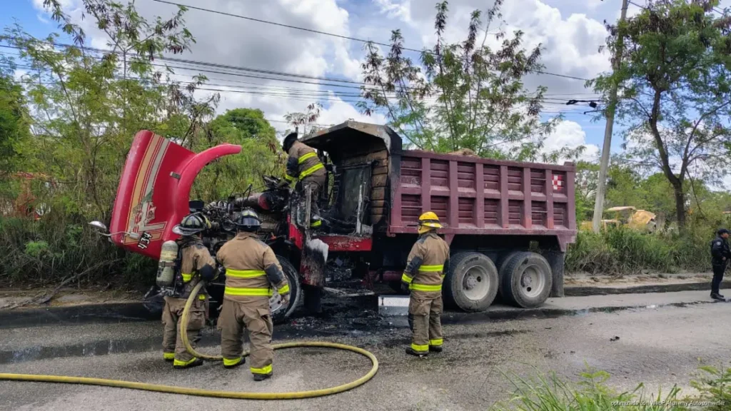 CANCÚN, Quintana Roo, 02 de abril de 2026.- Un aparatoso incendio de un camión tipo volteo se registró sobre el Arco Norte, a escasos metros de la avenida Niños Héroes, presuntamente a causa de una falla mecánica, dejando como saldo al operador de la unidad con diversas quemaduras.