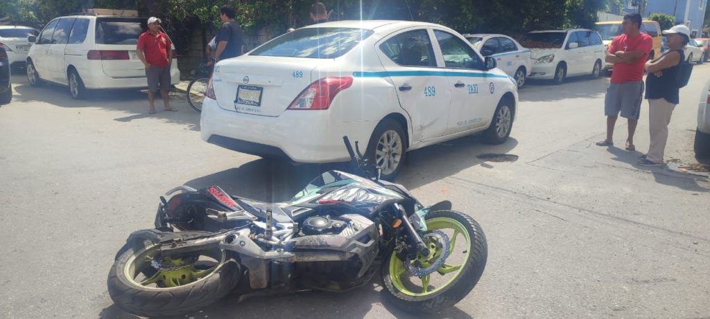 PLAYA DEL CARMEN, Quintana Roo, 5 de Agosto.- Taxista colisiona a un motociclista esto en la colonia Ejido y lo manda al hospital, luego de que no hizo su alto en un cruce y se atravesó en la trayectoria de la unidad de dos ruedas, derribando a su chofer.