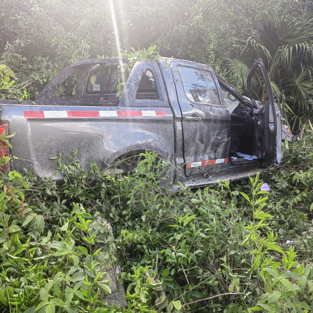De acuerdo con la información recabada en el lugar de los hechos se logró saber que la camioneta color gris obscuro asignado a las obras del tren maya era conducido de sur a norte sobre la carretera federal aparente a exceso de velocidad cuando el neumático trasero izquierdo reventó, lo que provocó que el conductor perdiera el control de la guía hasta terminar por salir de la cinta de rodamiento.