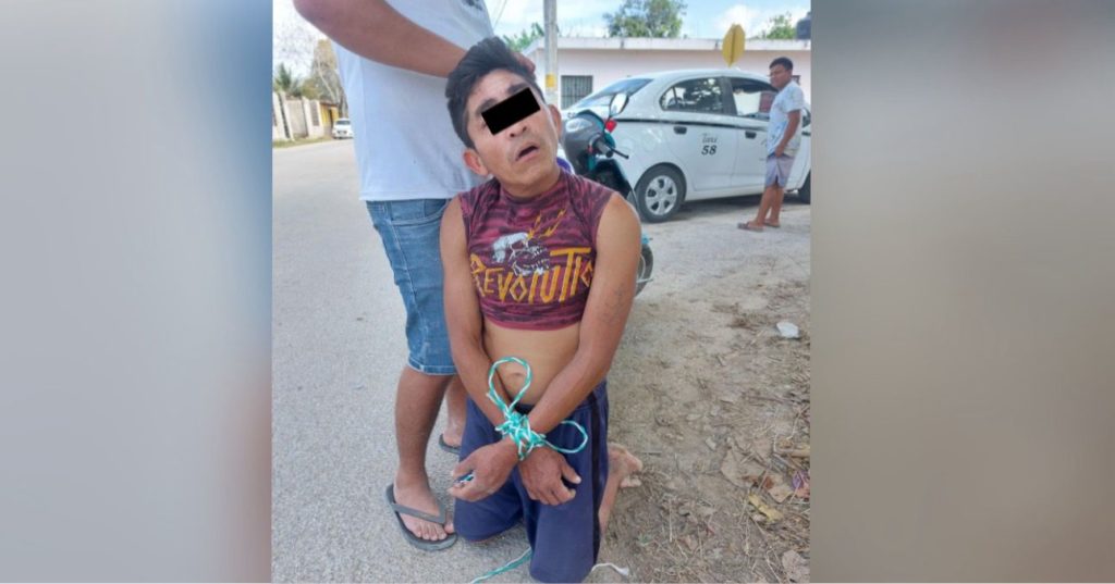 Felipe Carrillo Puerto, Quintana Roo, 15 de febrero de 2024. – Un grupo de vecinos de la colonia Cecilio Chi atrapó y amarró a un hombre luego de ser descubierto robando dinero en efectivo en el interior de una vivienda, pese a sus intentos por escapar no lo logró por lo que fue entregado a los elementos de la policía municipal de Felipe Carrillo Puerto.