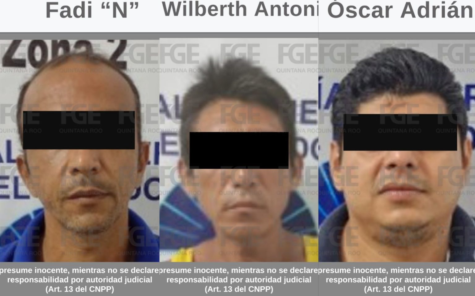 CHETUMAL, Quintana Roo,2 de Agosto.- Fiscalía General del Estado informa que, por separado, consiguió la vinculación a proceso de Wilberth Antonio “N”, Fadi “N” y Óscar Adrián “N”, por su probable participación en el delito de violencia familiar en agravio de víctimas de identidad reservada en el municipio de Othón P. Blanco.