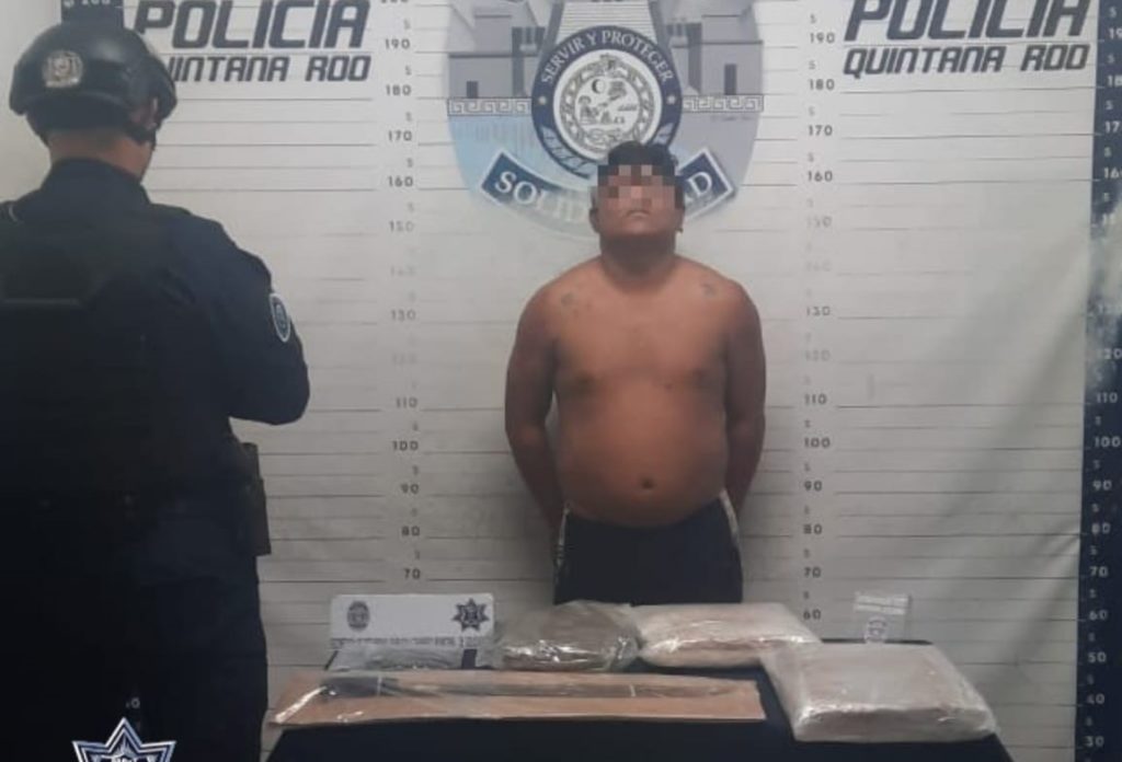 Tras lograr asegurar a José “N” de 21 años de edad, originario de Yucatán, los elementos de la Policía Preventiva encontraron entre sus pertenencias una bolsa negra que contenía 1 envoltorio con posible marihuana y 2 con una sustancia a determinar, así como un machete.